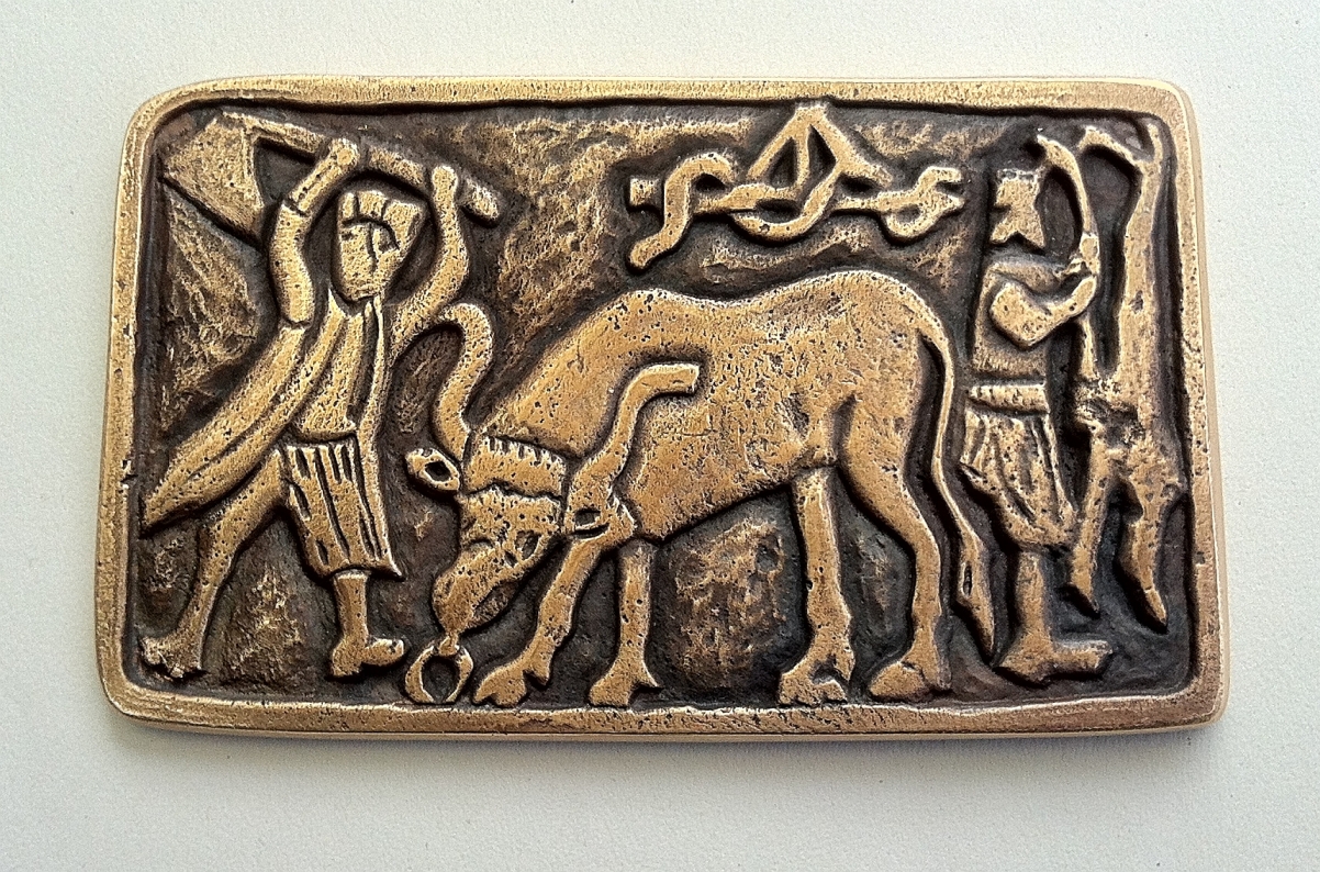 Frei gearbeitet nach einem Motiv auf der Tür der Stabkirche von Hylestad / Norwegen (Original Holz, 12. Jh.). Das Motiv zeigt die Schwertprobe auf dem Amboss: Siegfried zerbricht das Schwert, während Regin bereits das nächste bereithält.